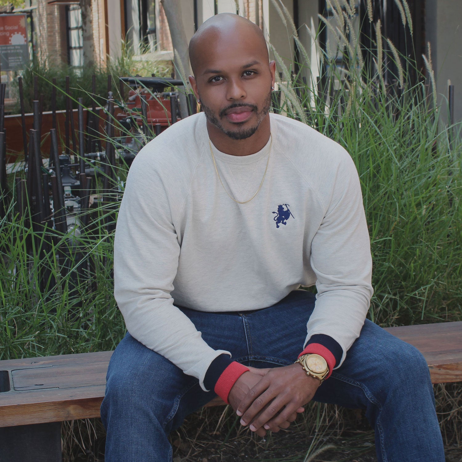 Mens Oatmeal French Terry crew neck embroidered Lion Crest logo left chest.