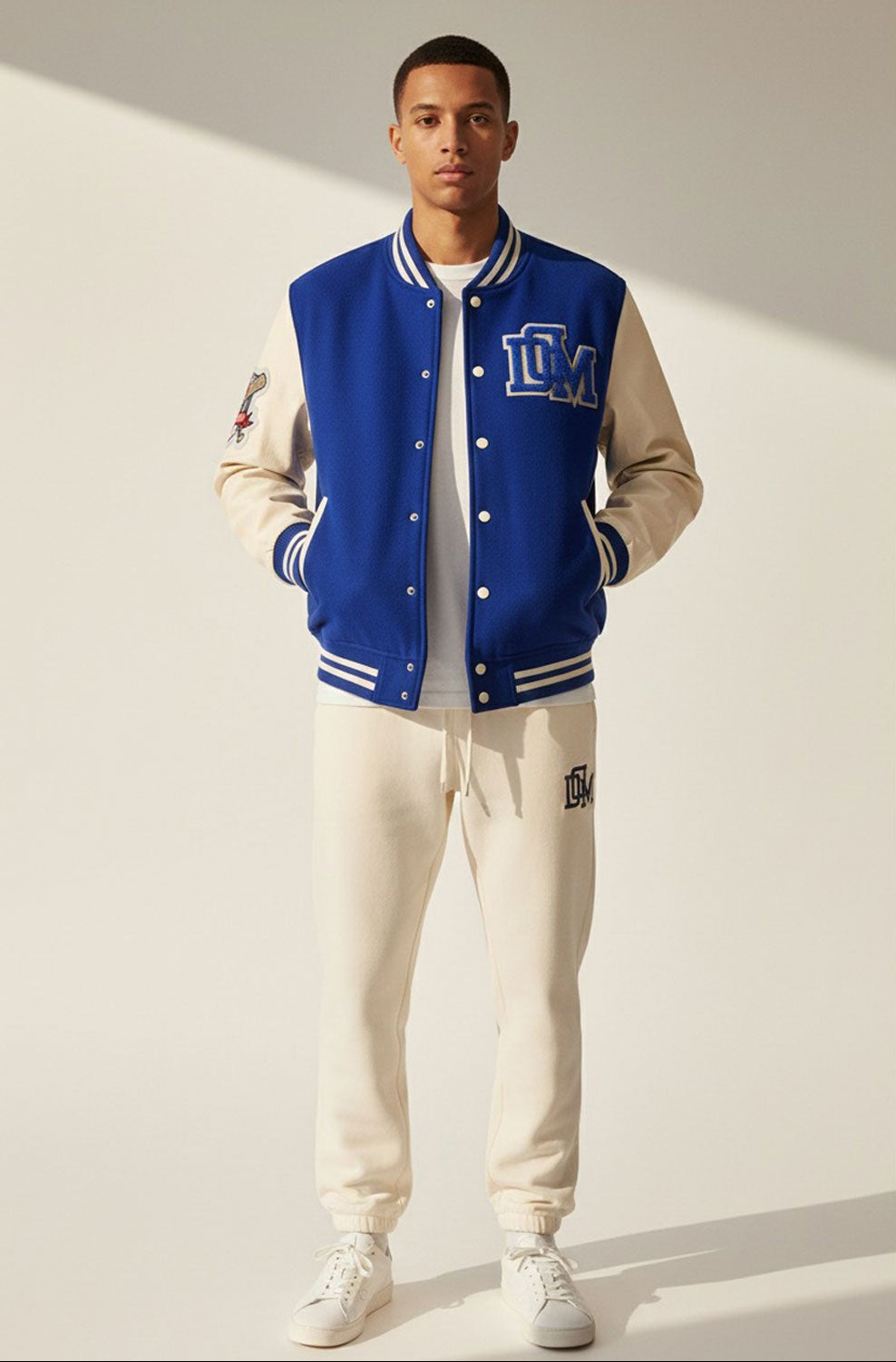 The DonDeMarco Varsity Jacket is a standout piece that blends classic collegiate style with contemporary flair. This jacket features a bold blue and white color scheme, reminiscent of traditional varsity jackets, but with modern design elements that make it unique. The jacket's aesthetic aligns with the brand's commitment to high-quality, stylish apparel.